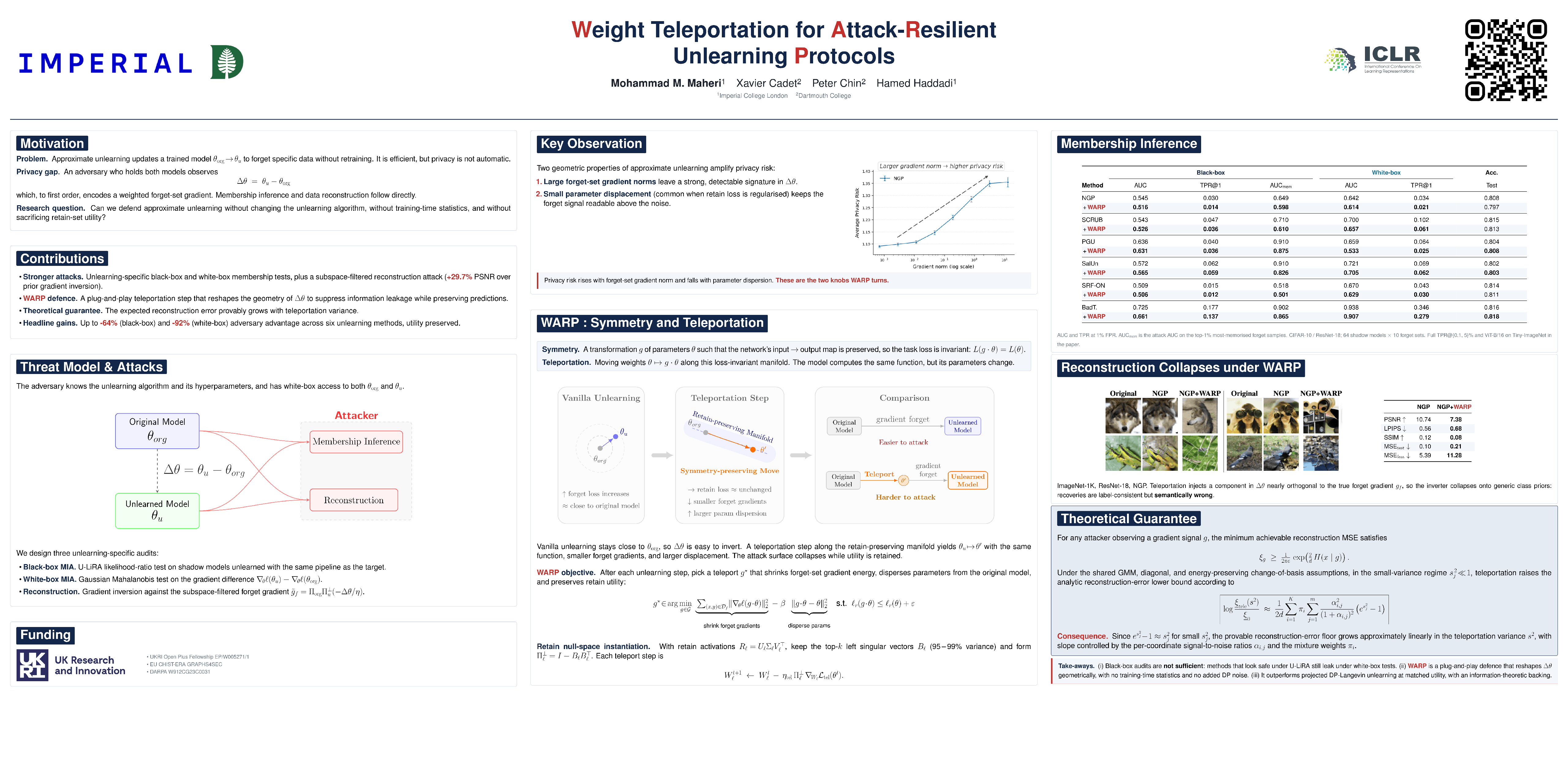 Approximate machine unlearning leaks: the difference Δθ = θu − θorg encodes a forget-set gradient that attackers can invert. WARP interleaves a loss-invariant teleportation step with unlearning — walking along a symmetry orbit of the network to shrink forget-set gradients and disperse parameters, all while keeping predictions on the retain set intact. Result: up to −64% black-box and −92% white-box adversary advantage across six unlearning methods, with utility preserved.